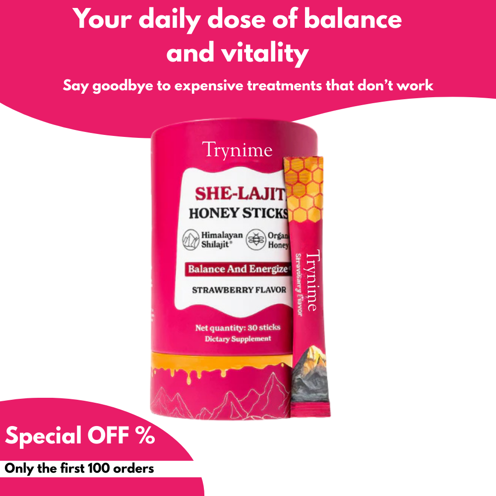 Trynime - She-Lajit Honey Sticks was crafted for women who want to take charge of their energy, mood, and hormonal rhythm. Whether you're postpartum, dealing with monthly symptoms, or seeking overall vitality, this blend of Shilajit, Shatavari and Saffronis your daily dose of balance. Wrapped in a delicious strawberry flavor, this formula fits effortlessly into your routine — and delivers results you can feel.
